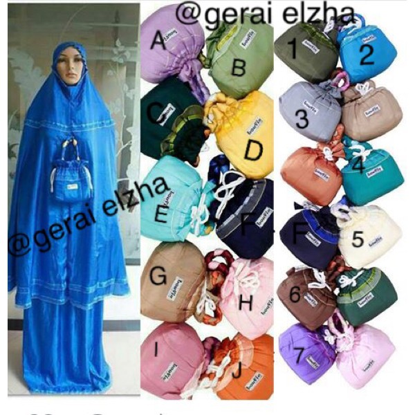 Mukena ini tersedia berbagai macam warna dan dilengkapi pula dengan tas kecil untuk wadah mukena.