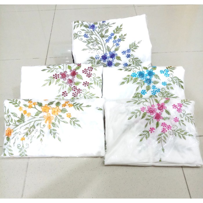 Mukena potongan atasan dan bawahan dengan aksen bordir simple 2 buah bunga pada bagian belakang bahan. Dapatkan promo mukenah terkini.